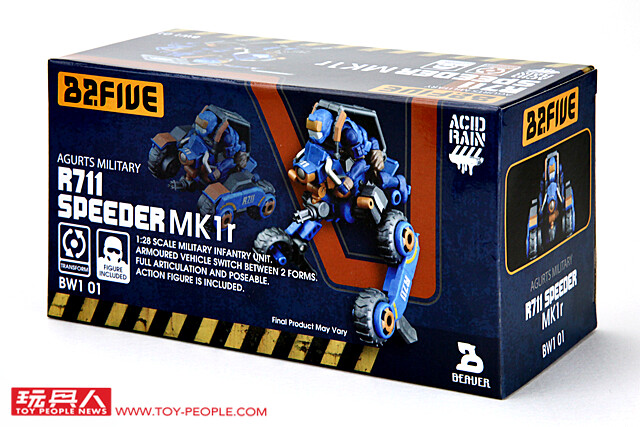 B2FIVE 所推出的《酸雨戰爭》1/28 比例系列,擁有[可動]、[變形]、[成形色]、[互換]與[收集]五大樂趣;繼承了原本《酸雨戰爭》的世界觀,將3.75吋的人偶縮小為2.5吋,並使用成型色的形式來取代複雜的舊化塗裝,使得2.5吋系列售價低於3.75吋一半以上,更加便利大量徵兵、收集的玩具人! 雖然尺寸縮小,但是完整地保留了人偶的高可動性,與創意又好玩的變形機構。最後還導入了「互換」的構造設計,不同的機體之間能夠相互交換零件,讓各位玩具人能夠盡情地發揮創意改造或升級自己的機體,收集越多款式越好玩!