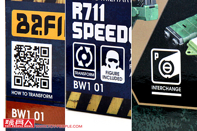 ▼ B2FIVE 系列的背面經常會看到的圖示。 由於為了節省成本,所以此系列並沒有說明書,而是以QR CODE的形式,讓各位玩具人自行上網觀看解說影片。 另外,還有多個不同的圖示,說明了此商品的多種特色:附屬人偶、可變形或可互換改造。