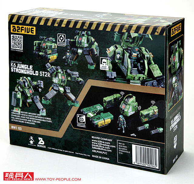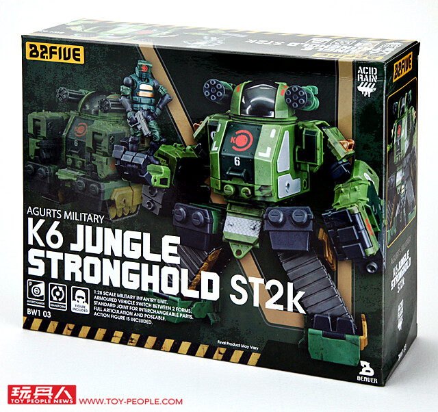 ▼ K6 叢林強襲堡壘(K6 JUNGLE STRONGHOLD)是《酸雨戰爭》系列目前所推出的最大級載具,並且擁有系列作中最有趣、最複雜的變形機能,能夠自由切換「坦克」與「機人」的雙重型態;被稱為「要塞」的STRONGHOLD ST2K,擁有厚重結實的強大裝甲,以及能夠對應遠距離與空中敵人的雙砲,還有對應中距離的兩門火神砲、裝備於雙手的致命強力火砲;最後則是能夠變形為機人型態近距離作戰,彌補了一般重型坦克機動性不足的缺點。