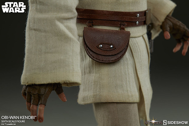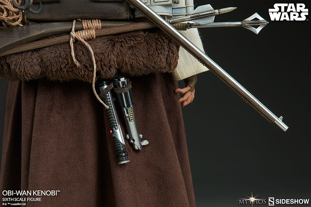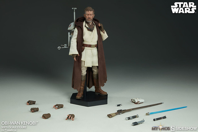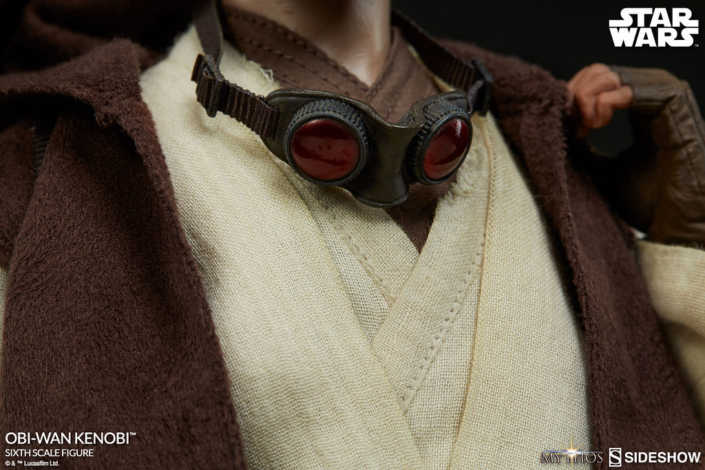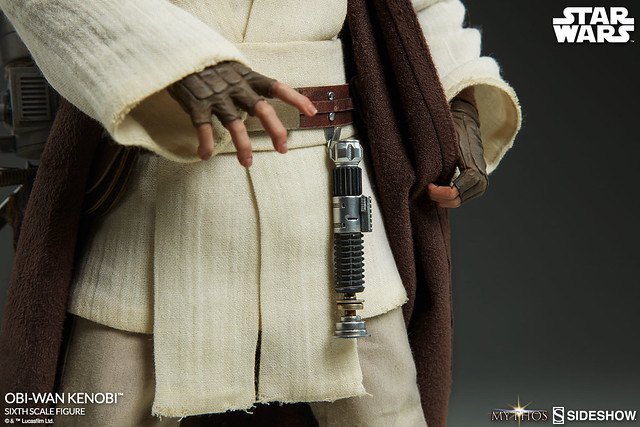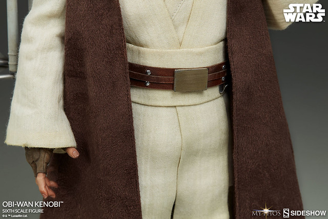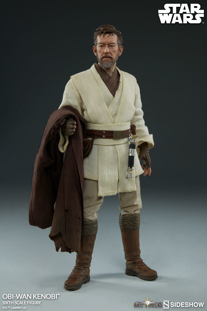 「歐比王·肯諾比 1/6 比例人偶」光是頭雕就是一大看點,彷彿融合了伊旺·麥奎格、亞歷·堅尼斯兩位先後飾演歐比王的男演員神韻,而原本褐色的鬍子上多了些花白的轉變,顯示歲月留下的痕跡,布料的絕地裝束、無袖棕色長袍,乃至於腰帶、長靴等服裝都相當寫實,其中的舊化破損更深刻帶出他漂泊的生活。