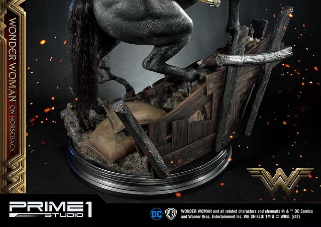 除了神力女超人本體,這匹黑色戰馬的動態展現也十分精彩呢!採用複合式材質打造讓整體更有變化性,肌肉線條的形塑搭配彎曲的四肢、還有因為架上馬鞍而收縮的腹部都使其看起來更有生命力,地台也絲毫不馬虎,損毀的車輪、沙包、鏽蝕的頭盔皆提升了作品的故事性,完整呈現出戰場的氛圍。