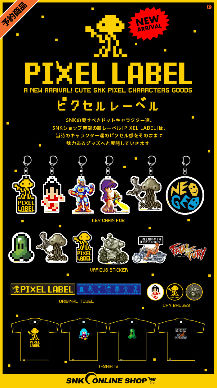 日本知名電玩廠牌「SNK」的網路商店:SNK online shop,宣布將推出以街機黃金時期的點陣遊戲圖像所製作的商品系列 - 『PIXEL LABEL』。