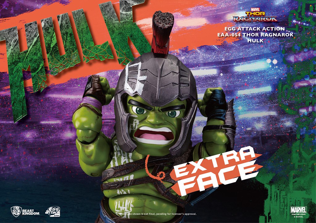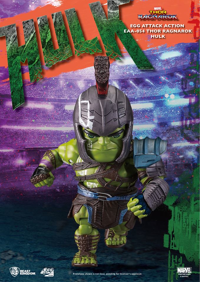 繼推出了角鬥士索爾(Gladiator Thor)的作品之後,野獸國公司又將在旗下Egg Attack Action 系列推出「雷神索爾3:諸神黃昏」(Thor: Ragnarok)版本6 吋的「角鬥士浩克」(Gladiator Hulk)Q 版人偶作品,喜愛霸氣浩克的玩具人不要錯過囉。