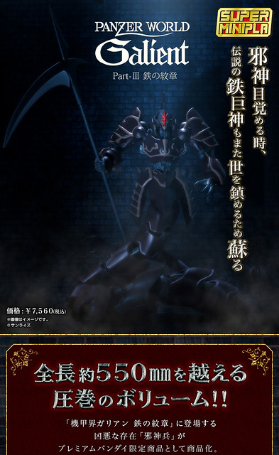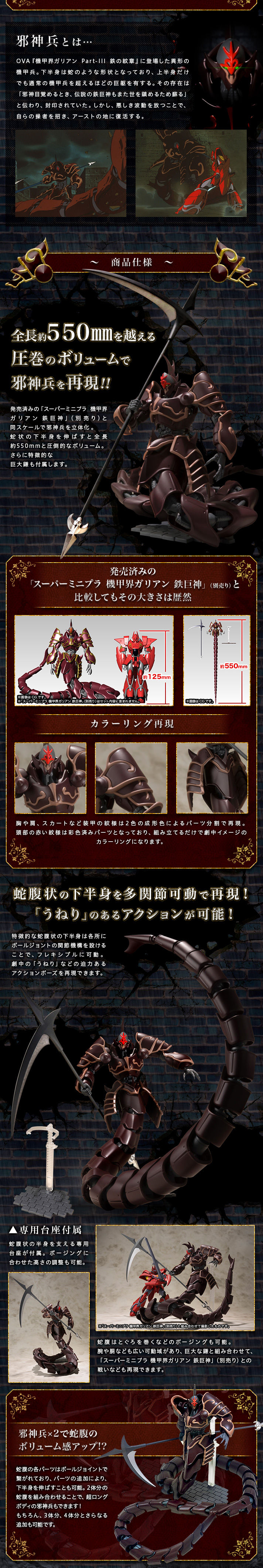 2017年10月20日新增官方宣傳照片與販售相關資訊,劇中有著下半身像是"蛇型體"的造型,同時又拿著一把巨大有著死神象徵"鐮刀",作為武器的等等設定令動畫迷們印象相當深刻啊!終於公開這次將以巨大的尺寸來呈現,全部機體長達約有55公分歐!這還要繼續稱為是"超級迷你盒玩系列(Super Minipla)"嗎?尺寸真的一點都不迷你啊!