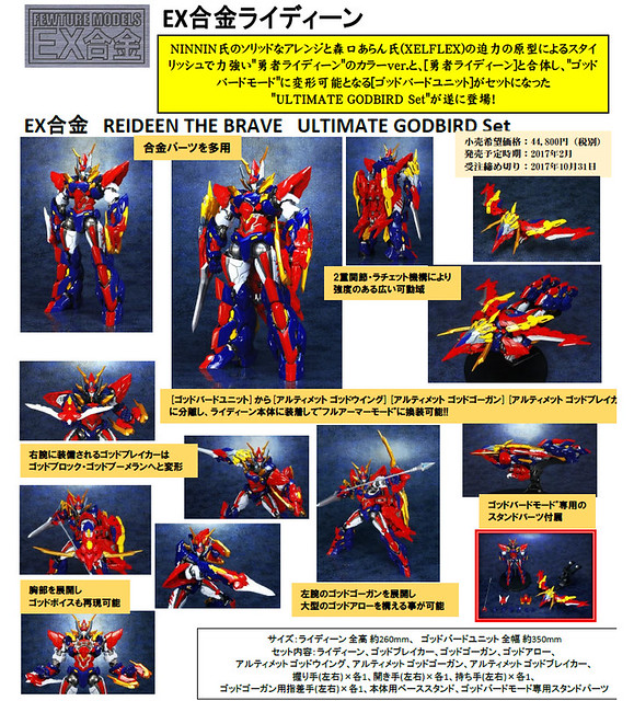 這次由"NINNIN氏"重新設計萊汀(ライディーン)的造型,再交給「森口あらん氏(XELFLEX)」來執行迫力的原型製作,並且將劇中可以變型成「神鳥模式(GODBIRD)」完整呈現出來,機體使用塑膠、合金材質以及ABS等等複合性材質來製作,豐富色彩的機體塗裝還附有可以替換手首、武器弓箭等等多款豐富配件喜愛《勇者萊汀》動畫系列的玩具人可以參考一下歐!
