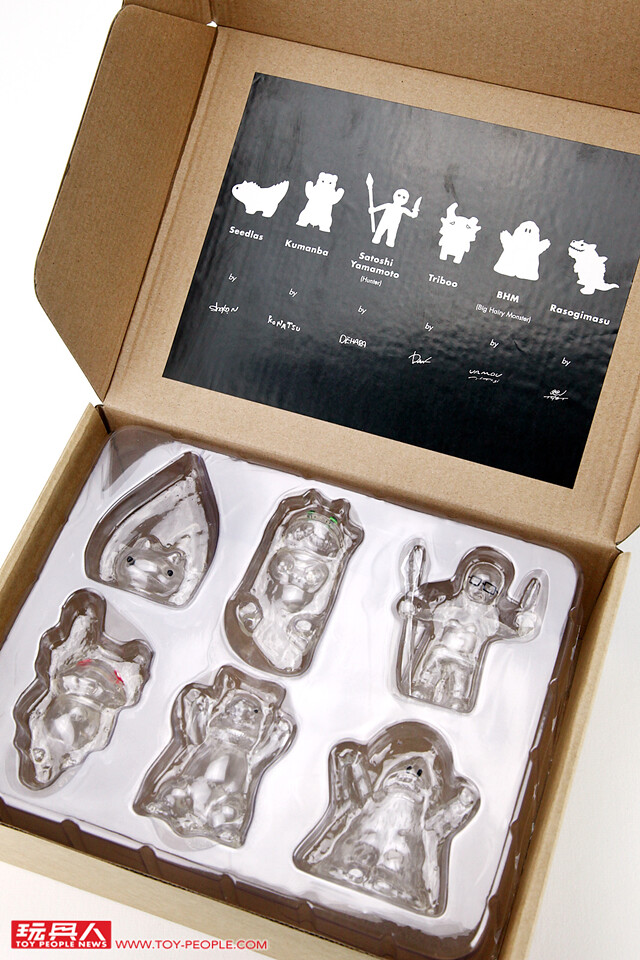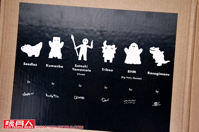 ▼ 打開盒蓋後,背面則是將這次六位藝術家所帶來六款全新角色創作的名稱與圖案呈現出來,包括(從左至右):Shoko Nakazawa 所帶來的「Seedlas」、Konatsu 所帶來的「Kumanba」、Dehara Yukinori 所帶來的「Satoshi Yamamot」(Hunter)、Dan 所帶來的「Triboo」、Studio UAMOU 所帶來的「Big Hairy Monster;BHM」以及T9G 所帶來的「Rasugimasu」。