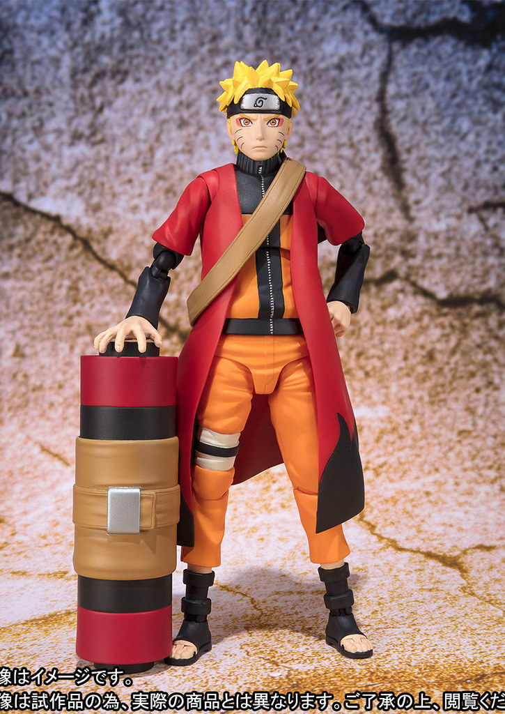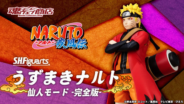 「S.H.Figuarts 漩渦鳴人 仙人模式 完全版」將漫畫第430 話及時趕回木葉忍者村的鳴人立體化,比之前推出的「仙人模式」更有魄力,雙眼呈現仙人模式特有的外觀,金色的瞳孔內眼珠變成橫條狀,在原本的修練服外再套了紅、黑長外套,身後巨大的卷軸也忠實還原;附有原本藍眼珠的替換頭雕,透過手部替換零件就能切換鳴人的兩種造型,還追加一對交叉的手腕,武器有一對苦無,攻擊特效零件則是螺旋丸與螺旋手裡劍,搭配多個替換手型就能再現鳴人使用忍術的帥氣姿態!