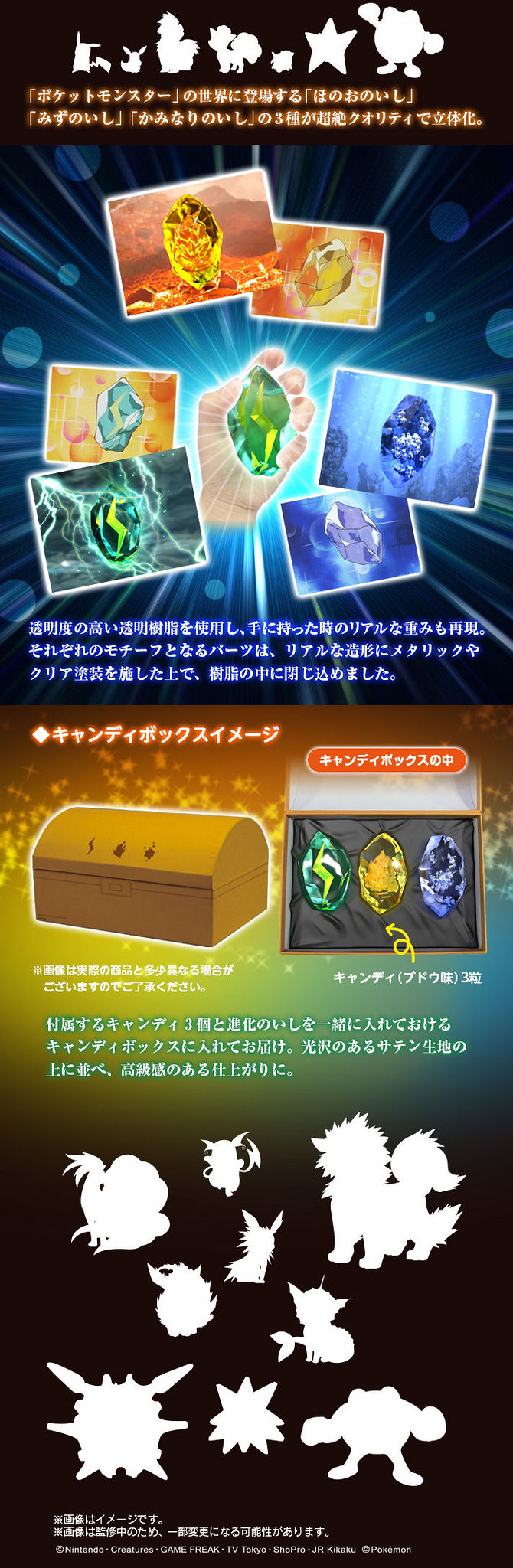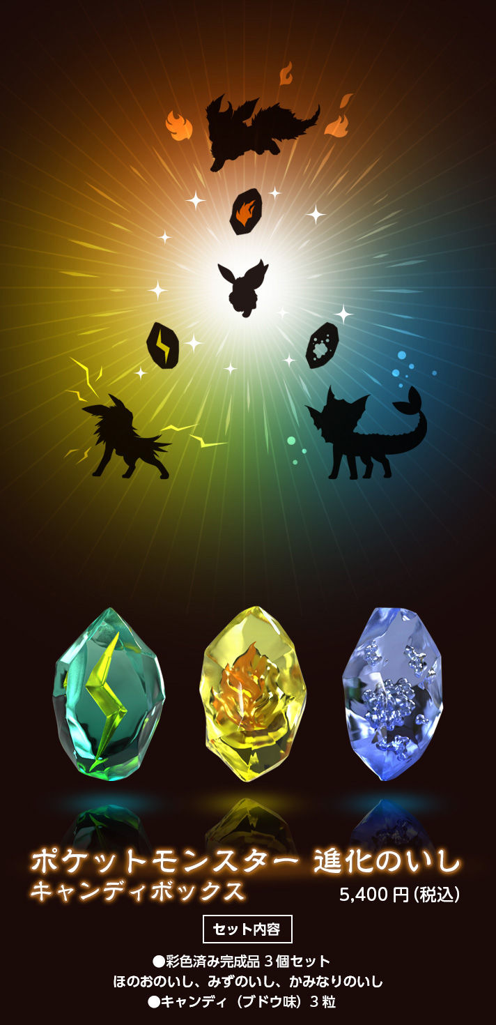 「進化之石 CandyBox」收錄了火之石、水之石、雷之石三種進化之石,使用高透明度的樹脂製作出礦石外型,內部鑲入極具質感的火焰、泡沫、閃電造型物,不論是重量感或是光澤都有夠真實!另外還附有「CandyBox」配件,內含三顆葡糖口味糖果但這不是重點,這箱子可以用來展示三顆進化之石,讓整件商品更具高級質感!
