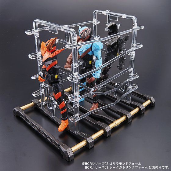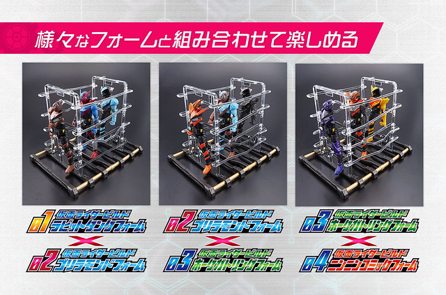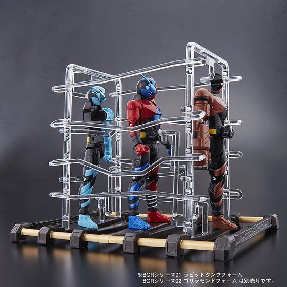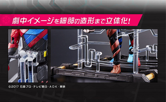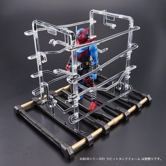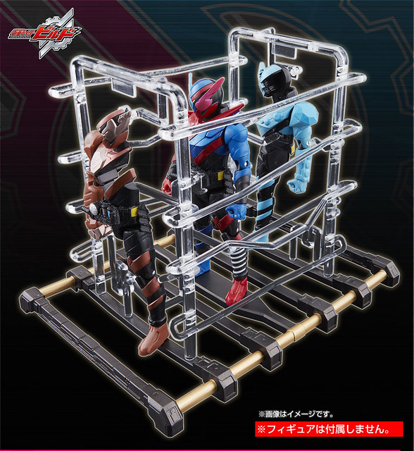 在《假面騎士Build》特攝劇集當中故事主人翁桐生戰兔,他可以使用兩款不同元素的瓶子來進行變身,在特殊的"變身過程"裡面就會出現這個「變身框架」,將前面、後面兩個"不同元素"的盔甲結合於中間騎士的主體,此次運用透明材質來製作其變身框架的支架設計等等,預計在Premium Bandai線上商店於2017年10月13日開始接受訂購,喜愛《假面騎士Build》系列的玩具人可以參考一下。
