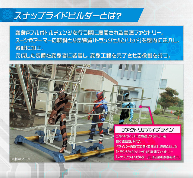 日BANDAI萬代玩具公司這次將針對最新上映的《假面騎士Build》特攝劇集所推出的為『BCR』可動系列,推出可以對應其人偶可動系列的「變身框架」ボトルチェンジライダーシリーズ スナップライドビルダ(名稱暫譯)。