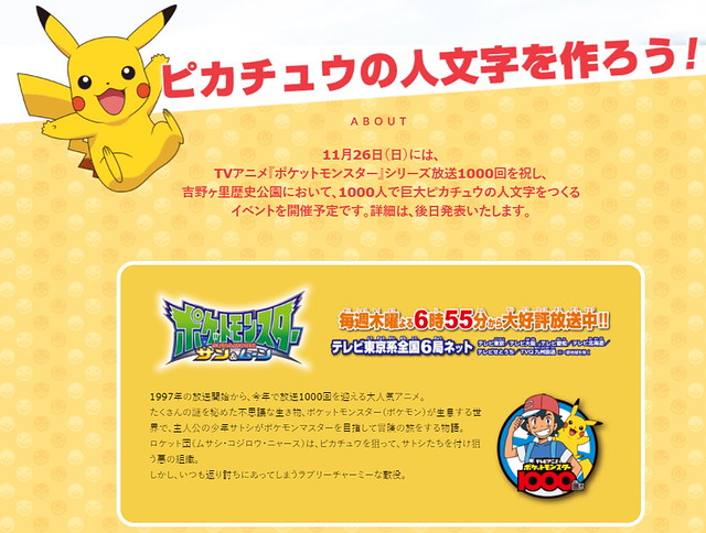 為紀念電視動畫《精靈寶可夢》系列播出 1000 集,官方將於 11 月 26 日在吉野里歷史公園舉行千人排列出巨大的「皮卡丘(ピカチュウ)」字樣活動,這有沒有可能創下金氏世界紀錄呢!?
