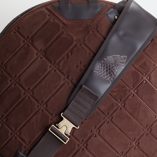 「史塔克家族盾牌後背包」依照劇中士兵背在身後的圓盾來打造,巨大的冰原狼頭相當搶眼,有著逼真的使用痕跡,外圍的紋路也十分考究,採單肩背帶的形式,皮革表面、黃銅金屬釦環、狼頭刺繡更提升了整體的質感,背包內外的軟墊材質在使用上更為舒適,背在身後絕對能同時達到帥氣、嚇阻的效果喔!史塔克家族的粉絲是不是要來團購一下啊~~