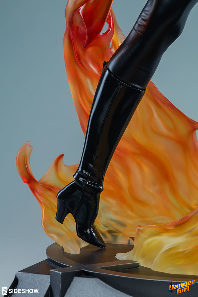 「艾比·琪絲 1/4 比例全身雕像」將J. Scott Campbell 繪畫的強烈風格完美立體化,火辣的身材、魅惑的神態都十分傳神,俏麗的金色短髮加上手槍實在很有「危險女孩」的特質啊!白色上衣的後半部有著看似透明的塗裝,貼身的長褲則採用布料材質製作,搭配散發火焰、鑲著「Danger Girl」標誌的造型地台更提升作品的完整性,而EX 版更追加印有「艾比」草圖的金屬立牌,擺在一起展示大大提升了收藏價值啊~