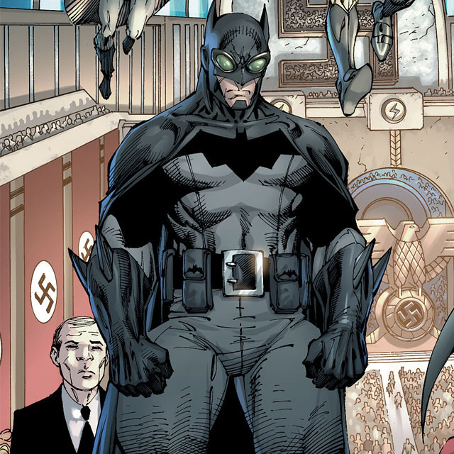 這款帥度破表的「戰術蝙蝠裝」新增了協助蝙蝠俠更易於操控蝙蝠車的護目鏡,以及在維持行動靈敏度的情況下,提高防禦性能的輕型裝甲,整體線條看起來更加洗鍊,也釋放出一股沈重的魄力;造型上則是向知名美漫大師「吉姆·李」(Jim Lee)繪製的平行時空EARTH-10 的納粹版蝙蝠俠致敬。