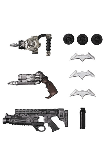 「MAFEX 蝙蝠俠 戰術蝙蝠裝Ver.」高約16 公分,完整重現這套戰術蝙蝠裝在劇中的樣貌,輕型盔甲刻畫地相當精緻並且施以逼真的舊化,增添作品真實感,展開的披風實在太帥氣啦~並包含普通、咬牙、掀起護目鏡三種版本的頭雕,武器部分也非常豪華,除了招牌的蝙蝠飛鏢之外,還附屬鉤索槍、蝙蝠手榴彈、榴彈發射器,小編完全被毒到了啊!