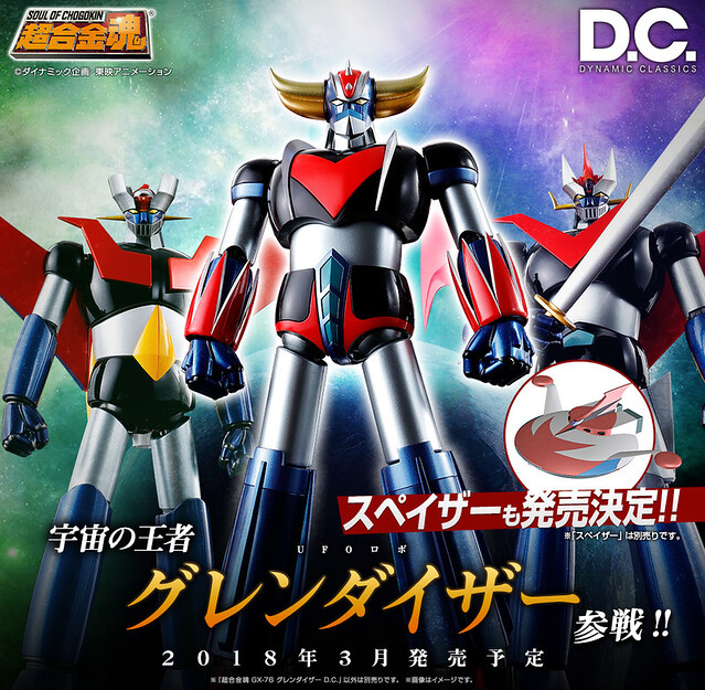 日Bandai萬代玩具公司受歡迎的超合金魂系列,繼推出「無敵鐵金剛 D.C.版本」、「金剛大魔神 D.C.版本」以及「蓋特一號 D.C.版本」後,近日官網公開將繼續推出編號GX-76的「克雷飛天神 D.C.版本(グレンダイザー D.C.)」的情報宣傳照片與販售相關資訊。