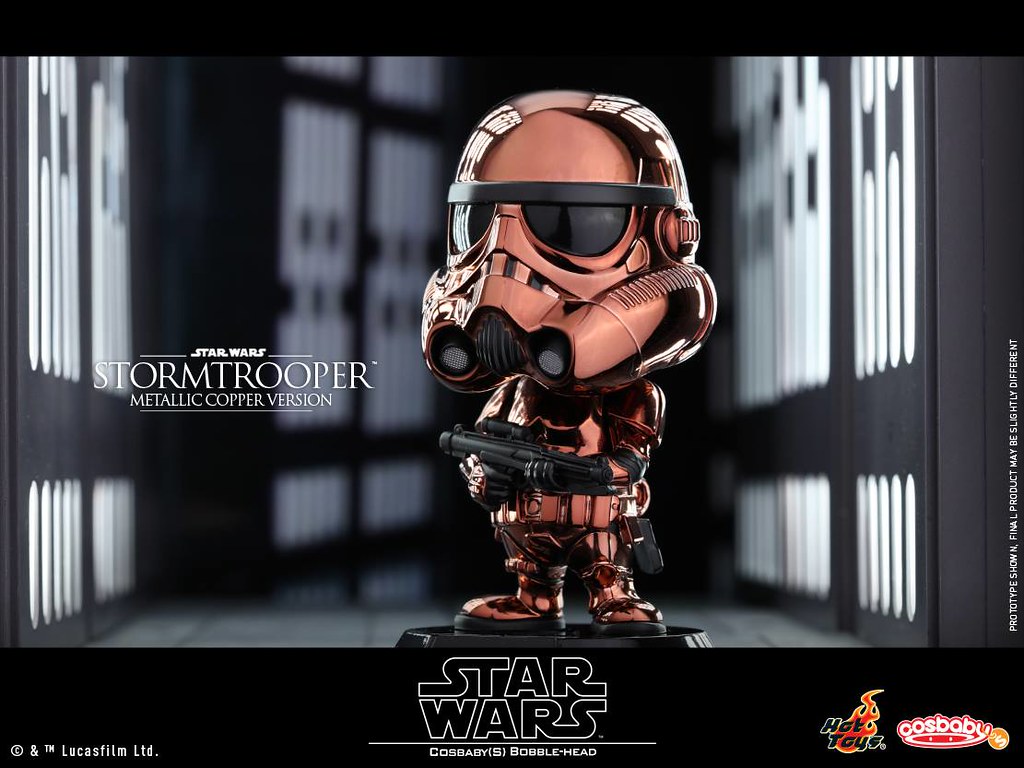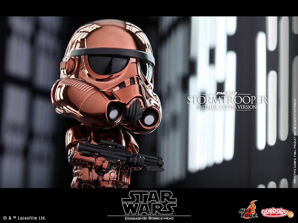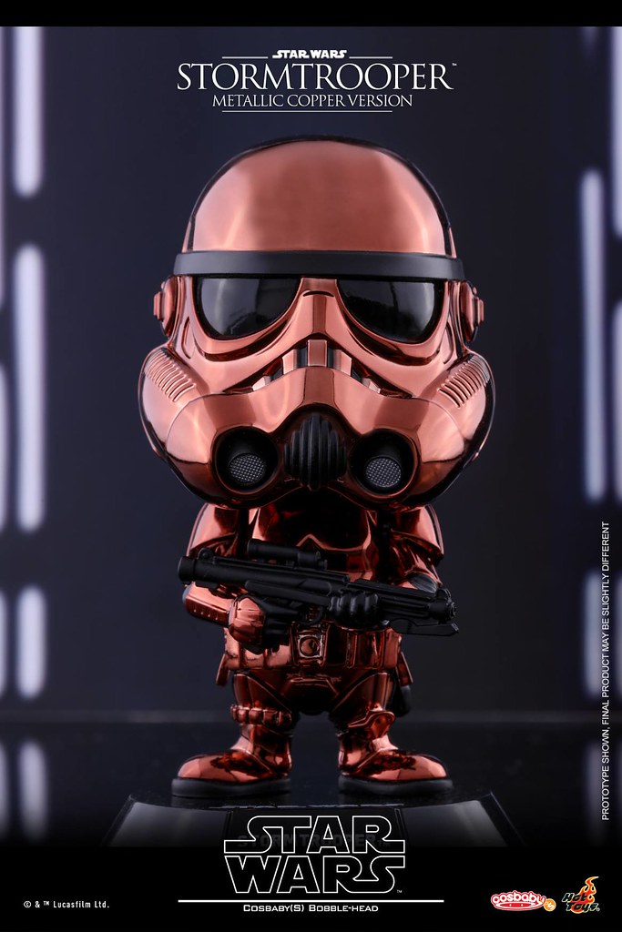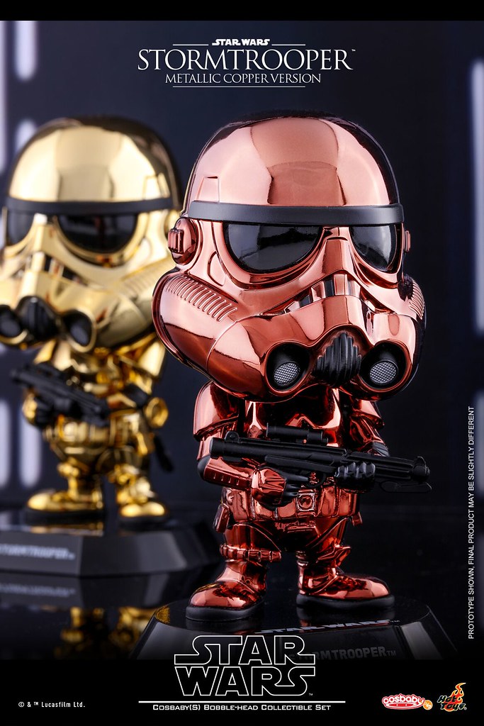 Hot Toys 曾經推出過1/6 比例的帝國風暴兵「金色電鍍版」、「紅銅電鍍版」,這次則將他們徹底Q 版化啦~以Cosbaby 系列推出過的風暴兵為基底,全身以帶有反光材質的金屬電鍍塗裝,看起來實在太豪華了,絕對讓風暴兵粉絲愛不釋手啊!