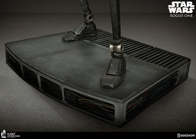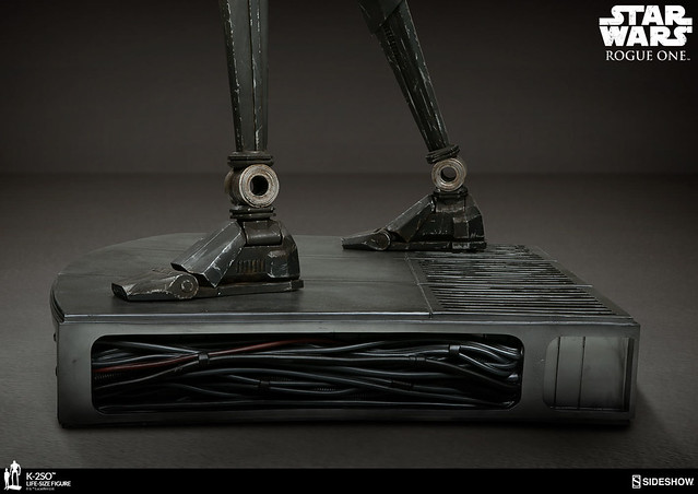 「K-2SO 1:1 比例全身雕像」全身有著大量的造型細節,霧黑的金屬塗裝極具質感,零件接合處的活塞閥、裝置都精準的重現,盔甲上施以逼真的舊化戰損,刮痕、肩膀上脫漆的帝國標誌具有強烈的真實氛圍,頭部也設有發光裝置,讓你可以隨時點亮K-2SO 的雙眼,還原他啟動的模樣歐~搭配精細的造型地台很有身處於史卡利夫帝國星軍事基地的情境呢!