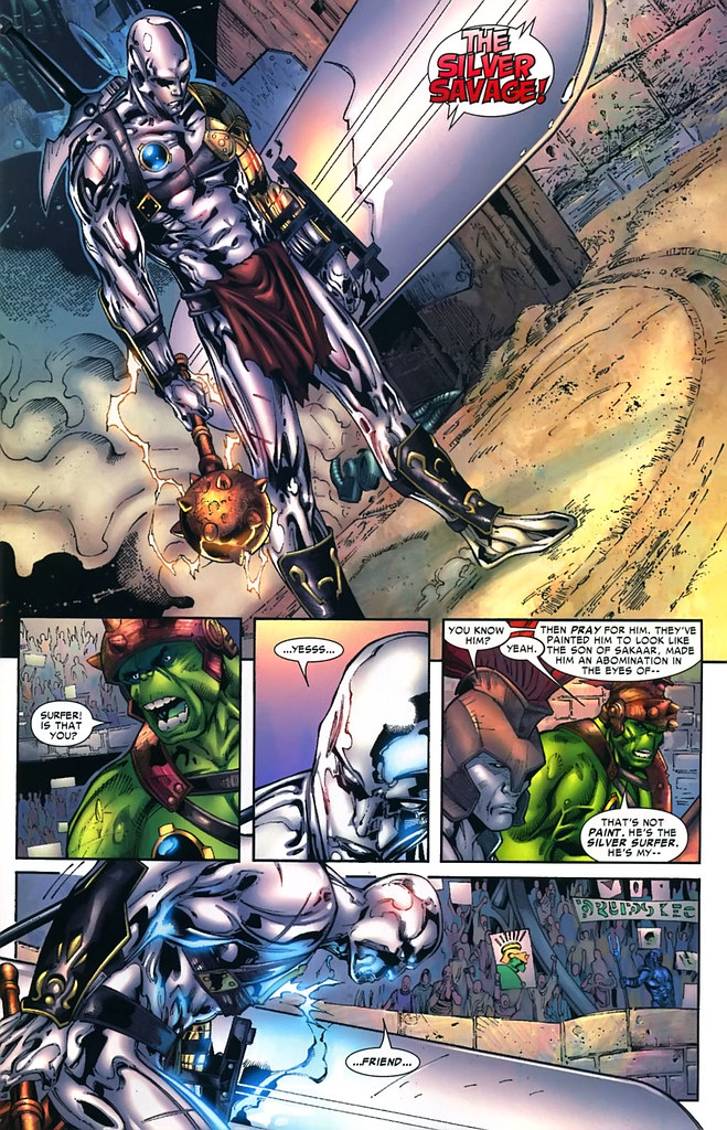 索爾看到浩克後大聲歡呼並說到他是工作上的朋友,其實是致敬《星球浩克》故事中,浩克被送到鬥技場看到銀色衝浪手時,他跟隊友解釋到說銀色衝浪手是朋友的情景,所以電影是反致敬,變成索爾對浩克說這句話,而銀色衝浪手的定位則由浩克取代。