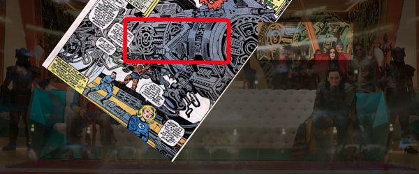 驚奇四超人64回漫畫內頁,石頭人舉起的巨大機器構造,跟宗師觀看鬥技場的房間其背後裝潢一樣,這個彩蛋是致敬 Stan Lee老搭檔 Jack Kirby的畫風,剛好今年是Jack Kirby的100歲冥誕,且索爾又是他與Stan Lee和Larry Lieber三人一起創造的角色,所以你會發現宗師的士兵還有一些相關的科技設定,都藏有滿滿強烈的Jack Kirby藝術風格~