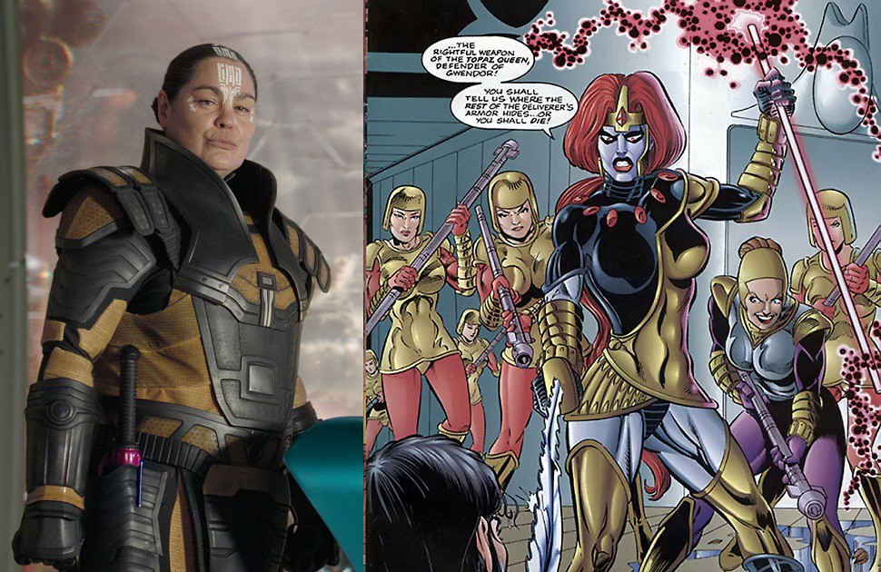 而按照設定與服裝配色來看,電影改編的是後者,因此各位可以看到服裝雖然款式不同,但配色是一樣的,此外電影版臉上的刺青剛好對應到漫畫版的頭冠。而這位女戰士版黃玉是他們宇宙的英雄團體Ultraforce裡最強的女英雄之一,這也是漫威第一次改編自家收購品牌裡的角色放入電影裡。