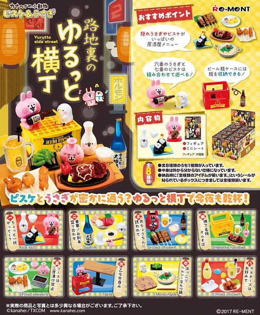 推出多款縮小精緻又有趣味的盒玩商品,而廣受好評的日本RE-MENT公司,之前以大人氣角色「P助 & 小兔兔(ピスケとうさぎ)」的題材,公開過"飽腹感的P助&小兔兔"、"P助 & 小兔兔的甜點店鋪"與"嘿!享受壽司愉快的一天"、"P助&小兔兔的餓肚子時光"以及"P助&小兔兔的甜點零食吊飾"等等有趣的盒玩作品後,這次將繼續推出最新作「P助&小兔兔 狹窄巷內的美食(ピスケ&うさぎ 路地裏のゆるっと横丁)」(名稱暫譯)。