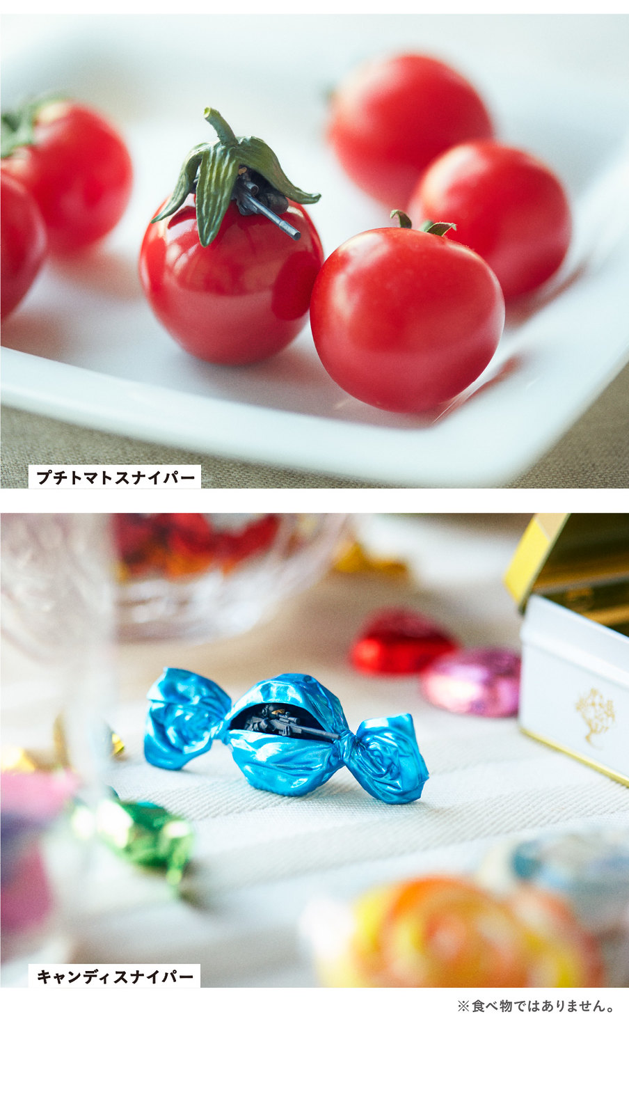 「微型狙擊手」再度展現他們無邊無際的設計巧思,把狙擊手需要偽裝、掩護的特性從戰場上轉移到日常生活,口香糖款的還以一顆口香糖來當作槍管的支撐實在太可愛了,藏身在番茄蒂下方的狙擊手更是令人笑破肚皮~每一款都很適合拿出來跟食物一起搭配遊玩,又是個要整套購入的轉蛋了!!
