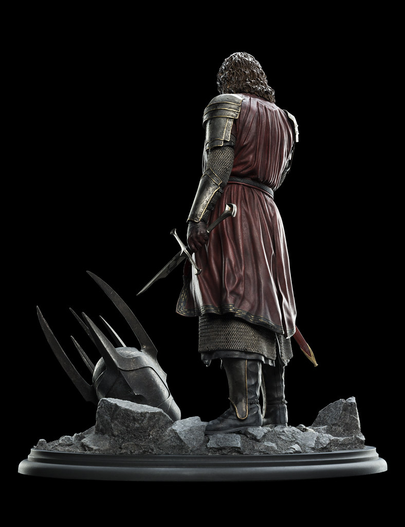 「埃西鐸1/6 比例雕像」再現了索倫敗亡、埃西鐸聚精會神地注視著魔戒的場景,以複合式材質忠實還原出埃西鐸的戰甲,污損及刮痕的戰損處理相當寫實,除了左手緊握納希爾聖劍的殘骸之外,灰白色的岩石地台上也有聖劍斷裂後的碎片,索倫的巨大頭盔更提升作品的完整性,充分展現了第二紀元聖戰結束的氛圍;雖然埃西鐸在《魔戒》出場時間甚短,卻是引發這段冒險旅程的關鍵人物,本作十分值得魔戒粉絲珍藏啊!
