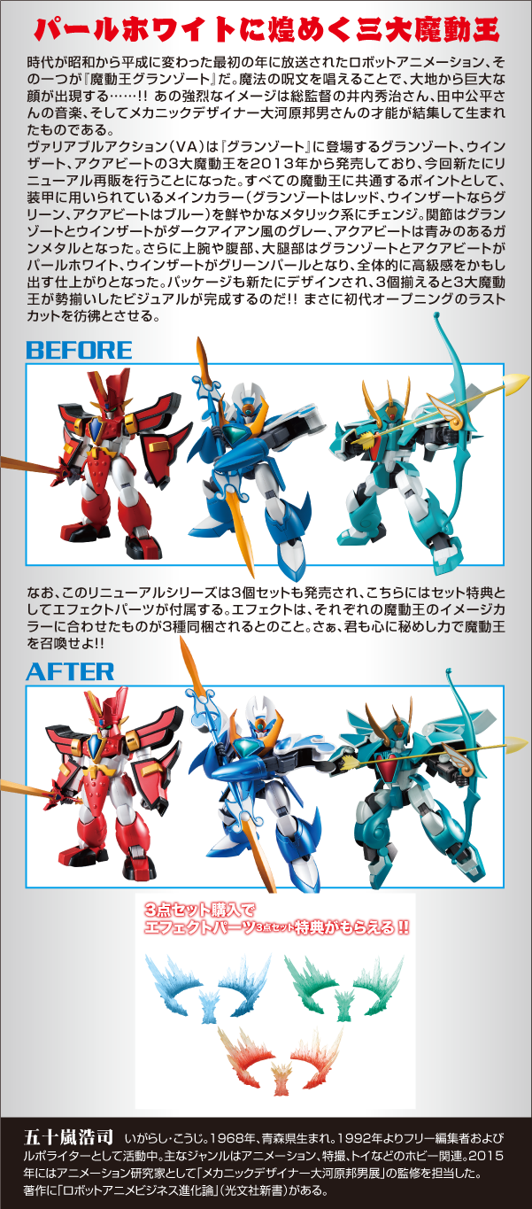 「魔動王」(魔動王グランゾート)是1990年在台灣電視公司所播放的經典卡通作品,當時翻譯標題名為「大無敵」,是當時6、7年級生家喻戶曉的動畫作品之一。這次將推出其特殊的「閃亮版本 三體共同販售(附特效配件)」グランゾート アクアビート ウィンザートセット Shining Ver.(エフェクトパーツ付)名稱暫譯,將三款動畫登場的主要機體施以"閃亮塗裝"再次來共同販售推出,另外同時也有"單獨一機"販售的閃亮版本。