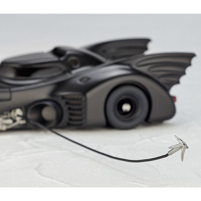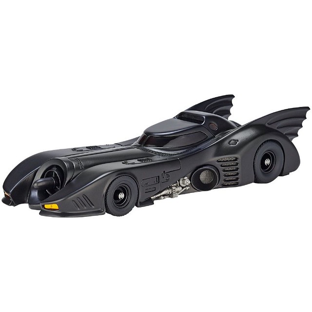 1989年的《蝙蝠俠》是由鬼才提姆·波頓執導,當時的蝙蝠俠是現在已經扮演過各種有翅膀的角色米高·基頓飾演,劇中的蝙蝠車則是安東·弗斯特(Anton Furst)設計,一改影集版蝙蝠車亮眼的配色、拉風的外型,改成素黑基底,搭配後方的蝙蝠側翼更加強了整部車的蝙蝠本質,除了低底盤的流線車體之外還配備大量武裝,小編覺得最酷的功能就是聲控啟動的防禦系統啦~