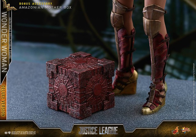 豪華版除了包含普通版神力女超人 MMS450 的所有內容之外,還附屬了一件黑色的羽毛斗篷,更增添了女神的神秘感,而且天氣也漸漸轉涼,讓我們的女神著涼就不好了(誤~ 另外一個配件則是「亞馬遜母盒」(Amazonian Mother Box),精緻的暗紅色塗裝營造出金屬的厚重質感,搭配有著「JUSTICE LEAGUE」字樣的造型地台讓本作的完整性再提升,女神的粉絲們千萬不要錯過啦~