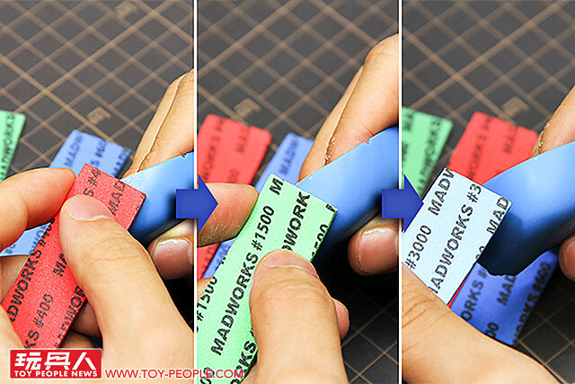 ▼ 接下來,我們以400號~600號~1000號~1500號~3000號的順序使用砂紙將湯口研磨去除,雖然操作繁瑣,但是以這樣的順序確實的研磨,就算是完全不上漆的純素組,也能不留刮痕的將零件製作的非常乾淨漂亮喔!