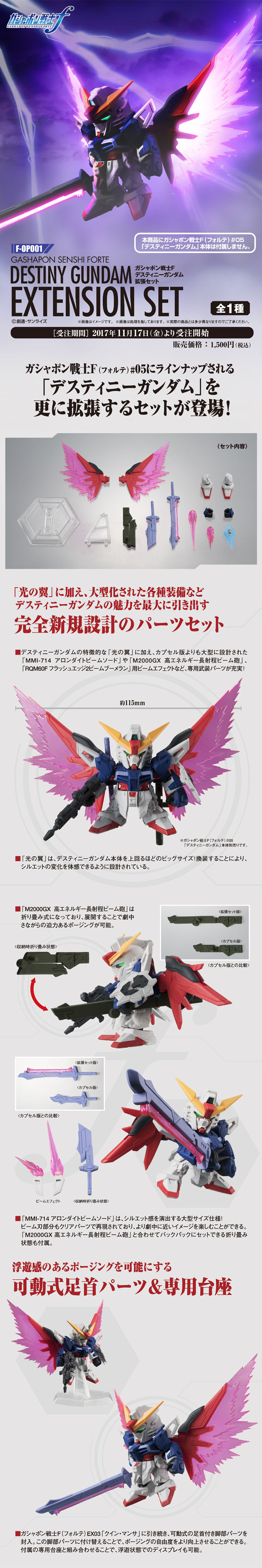 之前系列的第五彈收錄有《機動戰士鋼彈SEED DESTINY》動畫作品當中的主役機體「命運鋼彈(デスティニーガンダム)」,此次將針對其機體特殊的「光之翼」擴張配件完整呈現,裝備起來的尺寸長達約有11.5公分,還有專用武器「遠距離光束砲」以及格鬥武器「アロンダイトビームソード」各式大型武裝、專用支撐架、底座等等豐富配件都一一收錄此次的套件當中,此擴張套件預計於PREMIUM BANDAI(p-bandai)線上商店在2017年11月17日開始接受訂購,喜愛轉蛋戰士f系列的玩具人可以參考一下歐!