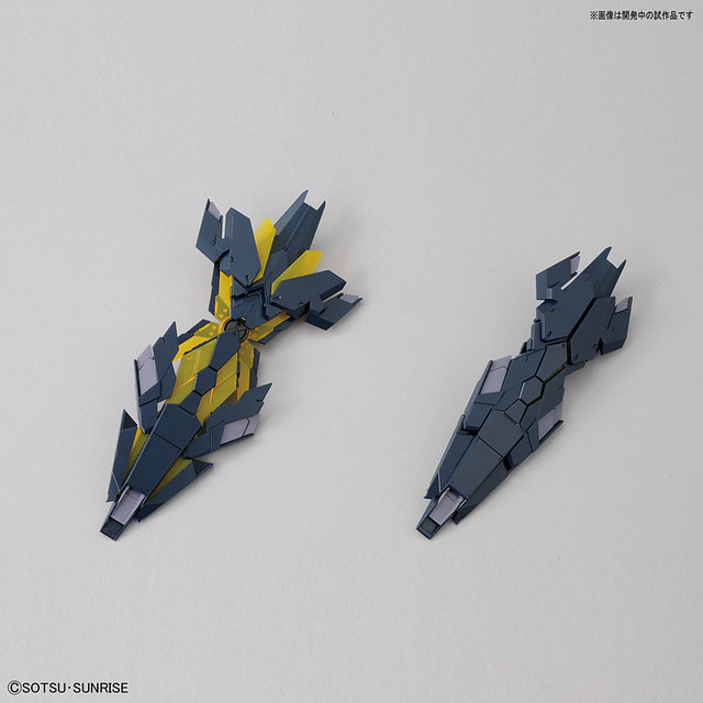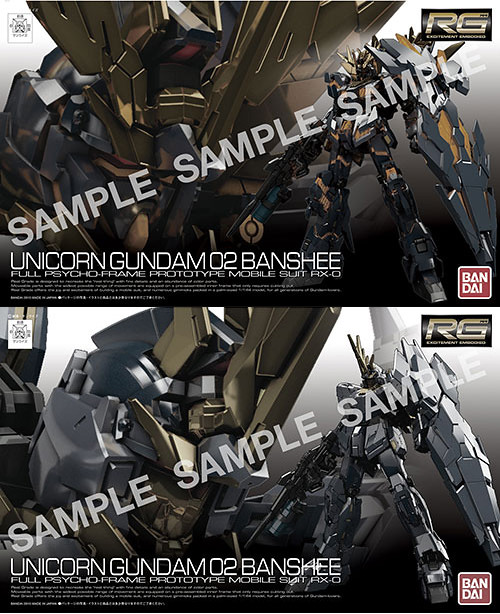 「RG 1/144 獨角獸鋼彈二號機 報喪女妖命運女神型」的套件沿用了兄弟機「獨角獸鋼彈」的設計,同樣使用令人驚豔、具有「ADVANCED MS JOINT」、「鎖定機構」、「連結機構」的新型骨架。外裝甲以黑、藏青、深藍等多色成形,並且以 RG 規格打造新規武裝「武裝戰甲XC」、「武裝戰甲DE」、「光束麥格農步槍(裝備迴旋發射器)」等新武裝!