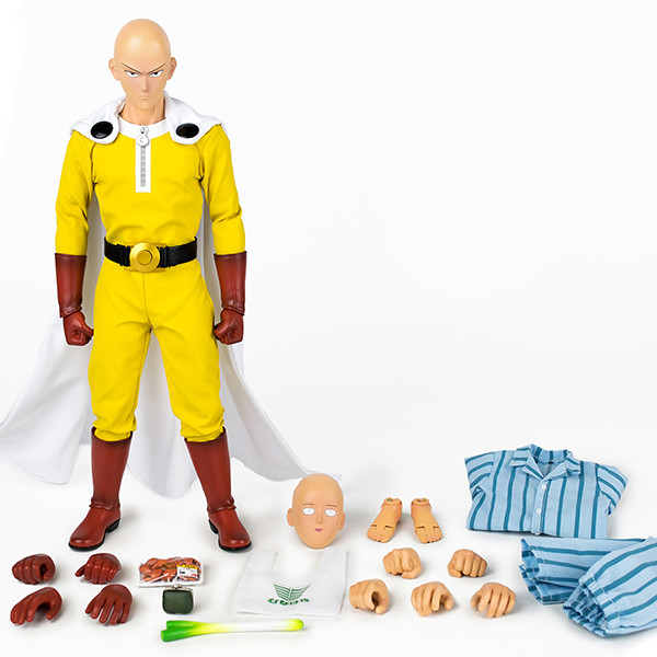 就和之前threezero 發行的「埼玉」一樣,除了招牌的黃衣、白披風英雄裝備之外,還追加一套可穿脫的日常服裝,這次的ThinkGeek 限定版附上超爆笑的直條紋藍色睡衣,配件則包含呆臉、帥臉的替換表情,戴著手套、空手的替換手型,可彎曲的光腳丫,以及Munageya 超市購物袋、蟹爪、大蔥等等營造出買東西日常的必備品,絕對值得一拳超人粉絲珍藏喔!