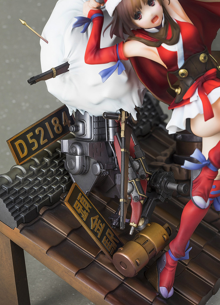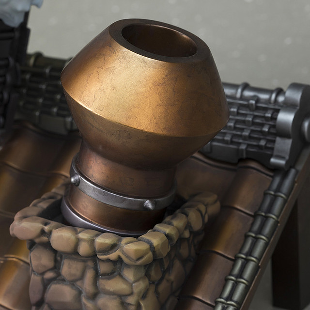 除了本體外,整個場景的塑造也相當精巧。讓聖誕無名差點跌倒的就是那包破底的禮物包啦!裡面全是槍械金屬並具備厚重的金屬塗裝,讓人感受到十足的重量感,還有一些尖銳的物體從側邊穿插出來,實在是很可愛呀XD!而底座的屋瓦、煙囪也透過細膩的塗裝呈現真實的物質紋理與色彩,質感極高!