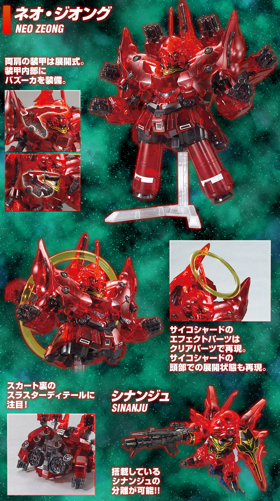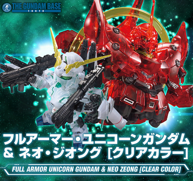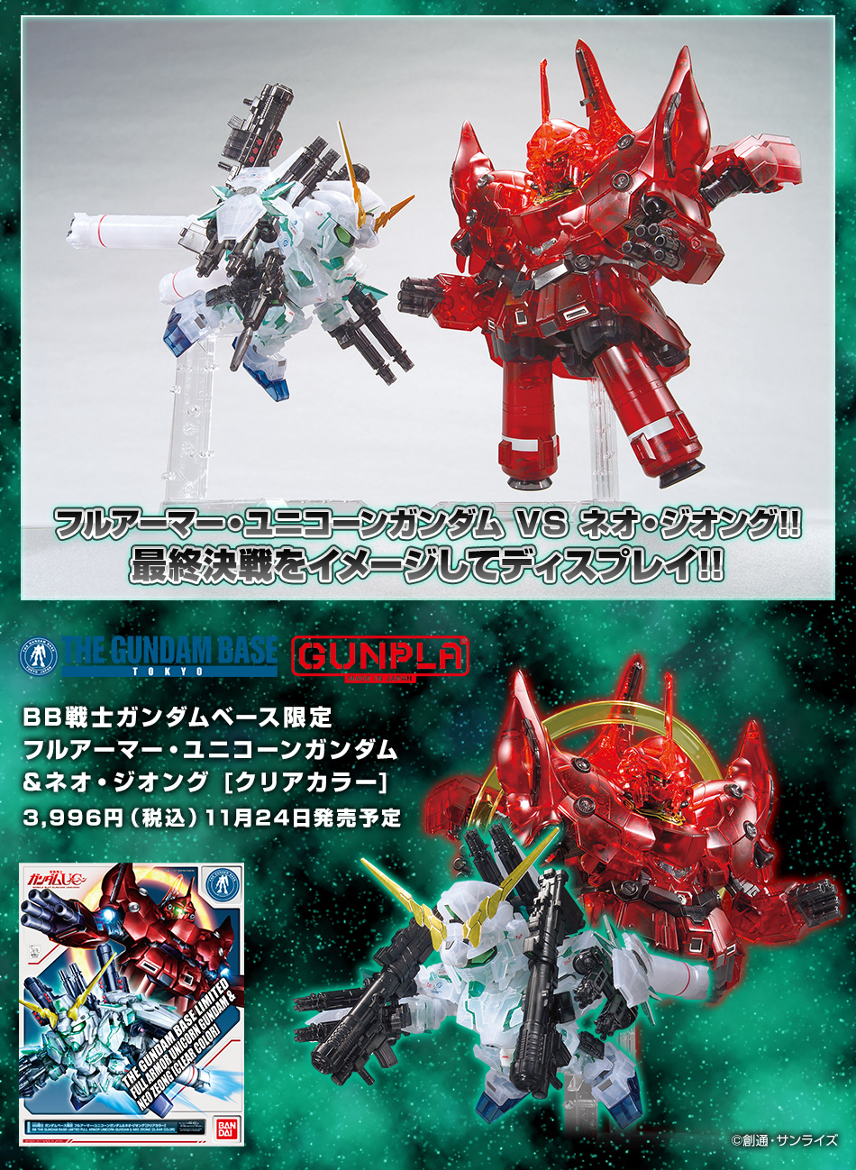由日本BANDAI萬代玩具公司所發行的眾多鋼普拉商品中,兼具可愛與帥氣,製作相當容易上手的「BB戰士」系列,這次將於THE GUNDAM BASE TOKYO 來推出「全武裝UC鋼彈 & 新吉翁克 彩透版本(フルアーマー・ユニコーンガンダム&ネオ・ジオング [クリアカラー])」(名稱暫譯)限定販售的商品。