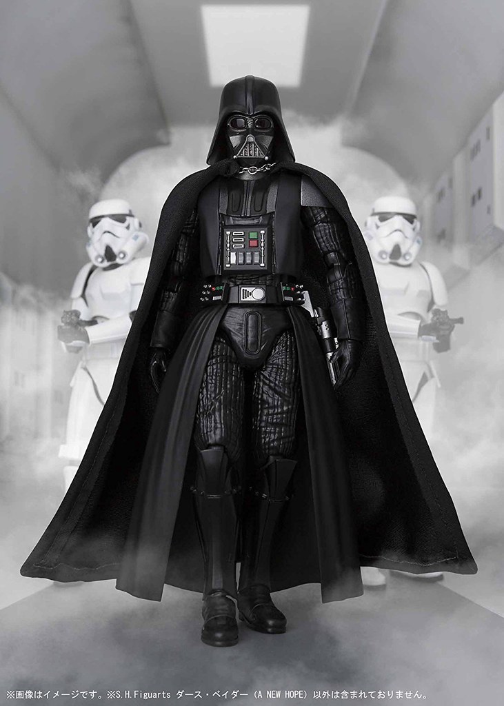 「S.H.Figuarts 達斯·維德(A NEW HOPE)」高約16.5 公分,與前作最大的差別在於披風採用布料的材質來製作,不僅提高把玩的變化性,黑武士的可動範圍也獲得提升,並同時兼具細膩的造型,附有多對替換手型和開啟、關閉的光劍零件;之前錯過黑武士的玩具人可以考慮入手歐,而最令人期待的還是那與之對決的老歐比王身影、以及在散落在地上的披風什麼時候會推出啊~