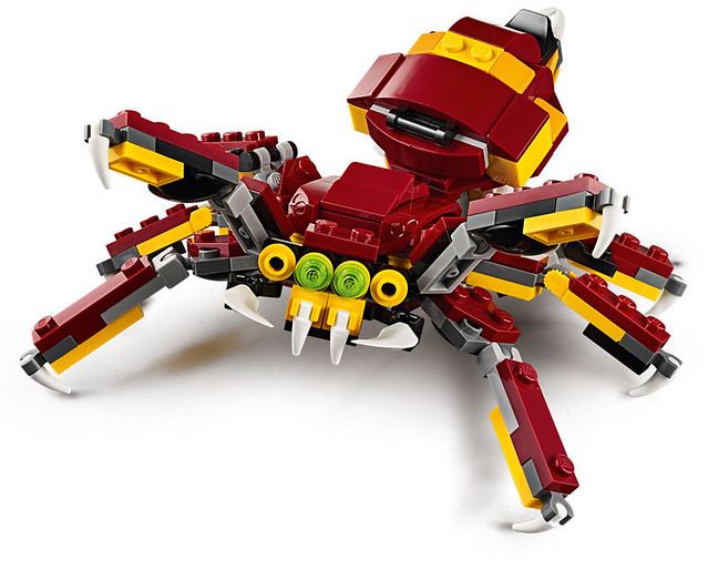 首先登場的是創意系列高人氣的三合一變形生物題材,繼上次LEGO 31058 的綠色恐龍題材後,這次再把顏色設定為搶眼的紅黃搭,並且有噴火飛龍、大蜘蛛、跟一隻超神奇的生物,如果有玩這個系列就知道噴火飛龍已經出過很多隻,整體而言大同小異,雖然蜘蛛也推出過,但小編覺得這次的蜘蛛在臉部牙齒、眼睛、腹部的造型呈現十分不錯!第三種型態就請各位玩具人一起來想想是什麼奇幻的生物吧~XD