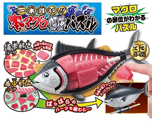 「黑鮪魚解體拼圖」是一款能夠邊玩邊學習、還會讓你感到肚子餓的拼圖玩具,整隻鮪魚由 33 塊零件所組成,包含了魚皮、魚骨、魚肉以及眼珠等各種器官都能夠拆卸下來!
