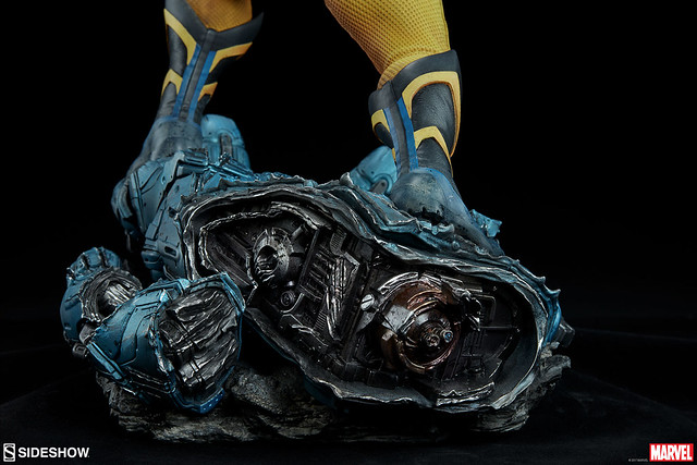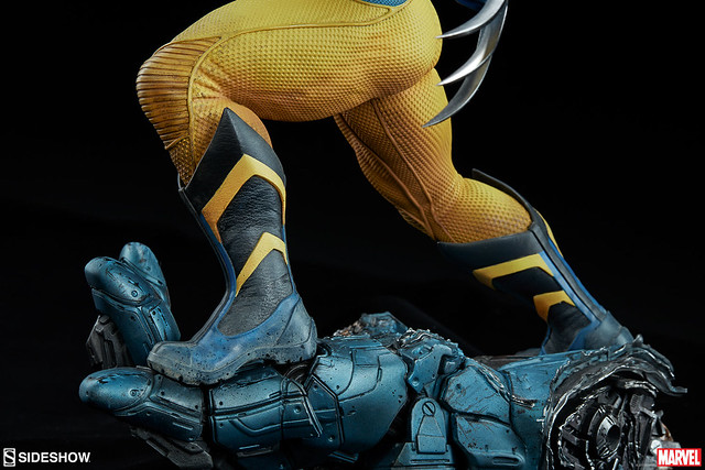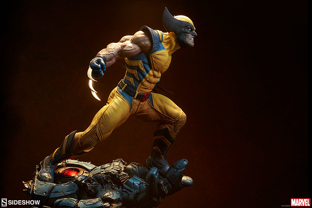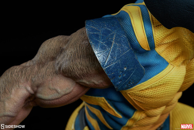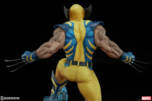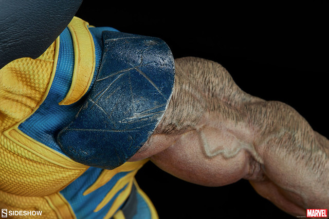 這次Sideshow 推出的金鋼狼雕像作品高約50.8 公分,可說是完整展露出狼叔極致的霸氣啊~凶狠的表情、前傾的身軀,以及伸長爪子的雙臂,彷彿隨時都可以衝上前將敵人撕裂!身穿經典的復古黃藍戰衣,除了緊身衣特殊顆粒材質的細膩刻畫之外,肩膀的護甲、X 標誌的腰帶也施以寫實的舊化,象徵這位硬漢身經百戰的故事性。