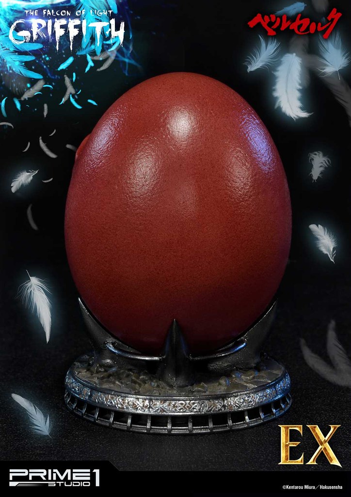 除了古力菲斯本體之外,地台也兼具極致的造型與魄力,霸王之卵有著透亮的綠色眼珠、寫實的皮膚紋理,周圍還有散落的白色羽毛,以及數支劍尖插入地面的劍,底座還點綴著「鷹之團」的標誌,刻文也相當細緻;值得一提的是EX 版還附屬了1:1 比例的貝黑利德(霸王之卵)和基座,而在Prime 1 Studio 官網預購更有追加特典「費姆特」的替換頭雕,能夠一次展現古力菲斯的兩種姿態喔!