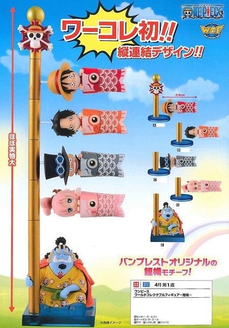 專門推出景品玩具的BANPRESTO旗下相當受玩具粉絲們歡迎的World Collectable Figure(簡稱為WCF)系列,以人氣持續高漲的《航海王》為主題推出多款作品讓海賊粉絲們持續不斷地收藏,這次將繼續推出相當特別的「鯉魚旗幟」篇,預計將以「海俠吉貝爾」為拿旗幟的基底,連接著「魯夫」、「魯夫」、「薩波」以及「白星公主」等人所扮成的鯉魚旗,也是WCF系列初次可以"縱向組合"起來的一套作品歐,喜愛《航海王》相關系列的玩具人可以參考一下歐!
