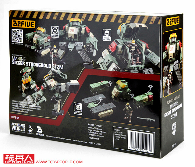 由香港知名立體書作家、玩具設計師Kit Lau 與新銳廠牌BEAVER 聯名合作的全新品牌「B2FIVE」,是一個將《酸雨戰爭》系列的世界觀,以1/28 比例的2.5吋人偶形式表現的系列作品。 本系列最大的特色在於擁有《酸雨戰爭》原有的[可動]、[變形]兩大特色,再追加[成形色]、[互換]與[收集]而成的五大樂趣;「B2FIVE」繼承了原本《酸雨戰爭》的世界觀,並使用成型色的形式來取代複雜的舊化塗裝,使得本系列低於3.75吋一半以上,更加便利於大量徵兵與收集。