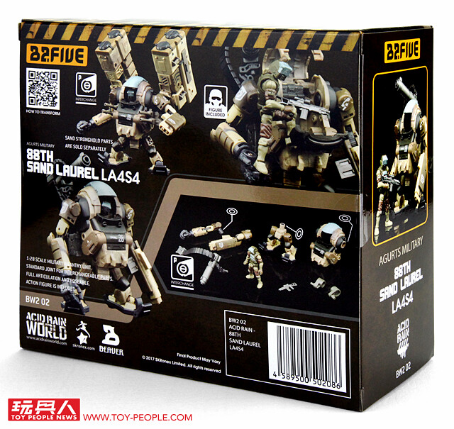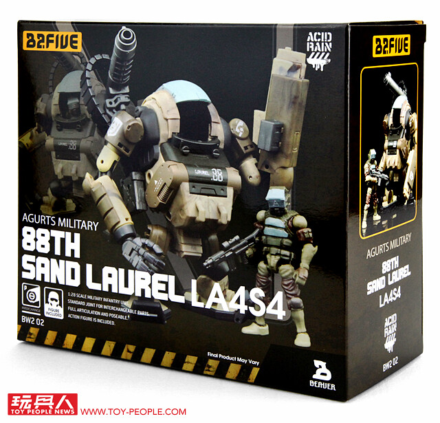 亞格斯陸軍開發出人形機甲「Laurel」核心機構之後,演化出多種運用的實驗機體;海軍陸戰隊版本獲得了成功之後,開始正式投入戰事,而推出多種款式。 88沙地人形機甲LA4S4 就是取得成功經驗之後運用而生的機體。隸屬於亞格斯第88沙地部隊,沙地人形機甲 LA4S4 配有重火力武器:手臂式機關槍及肩扛機關炮。 雖然人形機甲(Laurel)並不具有變形機能,但是帥氣的造型使其成為《酸雨戰爭》3.75吋系列最快售完的機體,衍生出的多款非戰鬥用載具也具有相當高的人氣,可說是酸雨迷們必備的經典。
