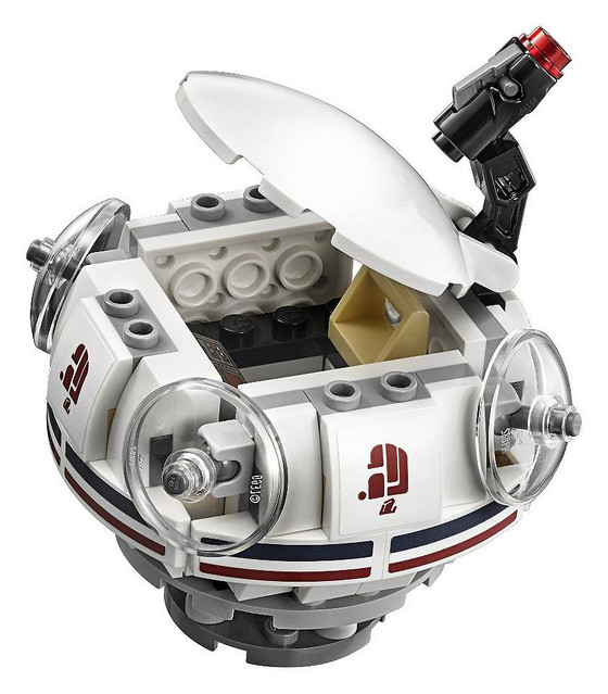 這次的盒組內容雖然較少,場景部分只有兩個小包廂跟一個吧台,但很有意思的是韓·索羅跟格里多的座位設有特殊的旋轉機關,只要轉動椅子後方的齒輪即可讓兩人再現槍擊場面,另一個亮點就是酒吧外面的球型機器載具「Ubrikkian 9000」,Ubrikkian 在星戰的世界觀中是一家生產交通載具的廠商,這顆球型載具圓滾滾的十分可愛,電影中只是放在酒吧外面,可能要狂熱星戰粉才會很有印象吧~如果已經入手「LEGO 75052 摩斯艾斯利酒吧」的話,小編覺得這組也很適合拿來擴充歐~