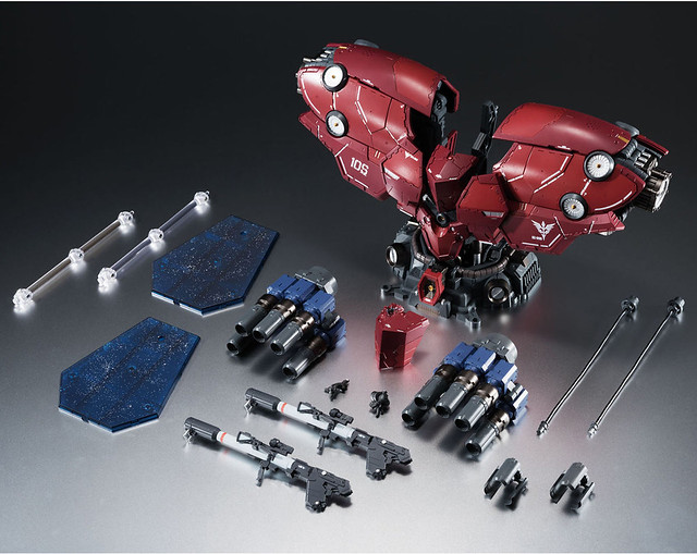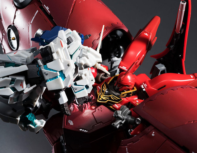 武器部份則有新安州使用的「雙火箭炮」、兩側手掌的「有線式大型感應砲」,可透過配件中的兩門「展開狀態」感應砲以及電纜,再現感應砲射擊的場景!此外,商品中還附有新吉翁克破損的胸甲、新安州損壞的雙臂零件,再現最終決戰中與獨角獸鋼彈肉搏,被「南斗水鳥拳」壓制的名場景!
