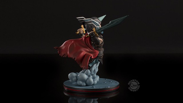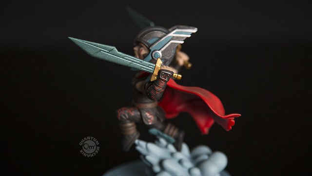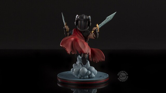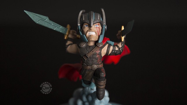 這次Quantum Mechanix 公司以可愛的頭身比例再現索爾飛躍而起的魄力姿態,角鬥士服裝的戰甲刻畫、腰帶細節皆有著精準的塗裝,搭配栩栩如生的表情、高舉雙刀的動作讓本作更逼真,雖然是Q 版人偶,但在肢體展現上極具躍動感!飄揚的紅色披也提升了整體的張力,並施以寫實的舊化,搭配白煙造型的地台,重現躍起瞬間揚起的沙塵。小編超希望能趕快推出浩克來一起搭配展示啊~