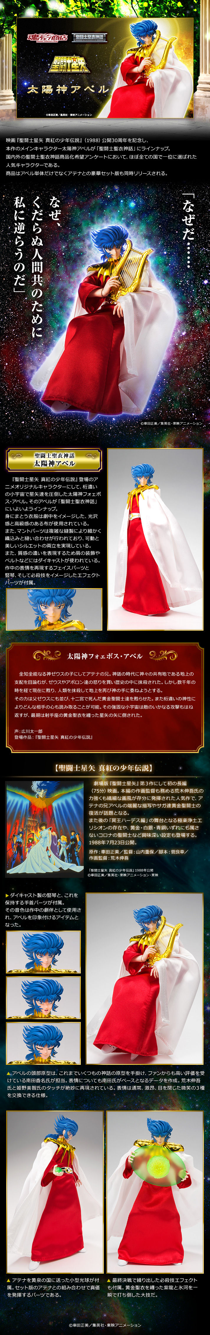 日Bandai萬代玩具公司暢銷熱賣的聖闘士聖衣神話系列,今日官網公開最期望商品化第一位的作品《聖闘士星矢 真紅的少年傳説》劇場版本當中的 「太陽神亞伯(太陽神アベル)」的商品宣傳照片以及販售相關資訊!