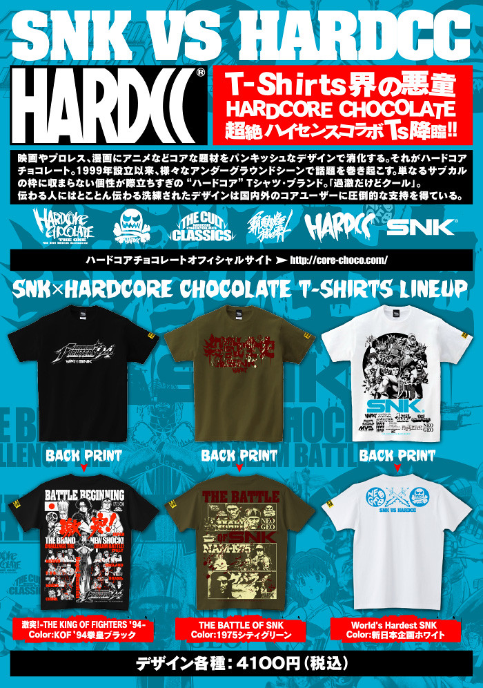 日本知名電玩廠牌「SNK」的網路商店:SNK online shop,宣布將與日本知名的異色潮流服飾廠牌、擁有「T恤界惡童」之稱的「HARDCORE CHOCOLATE(ハードコアチョコレート)」合作,推出聯名合作T恤系列,首波將推出三款以「格鬥天王」與SNK旗下電玩為主題的特色T恤,將於SNK online shop 上限定發行。